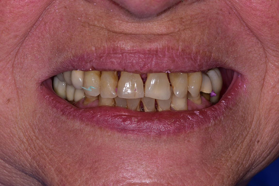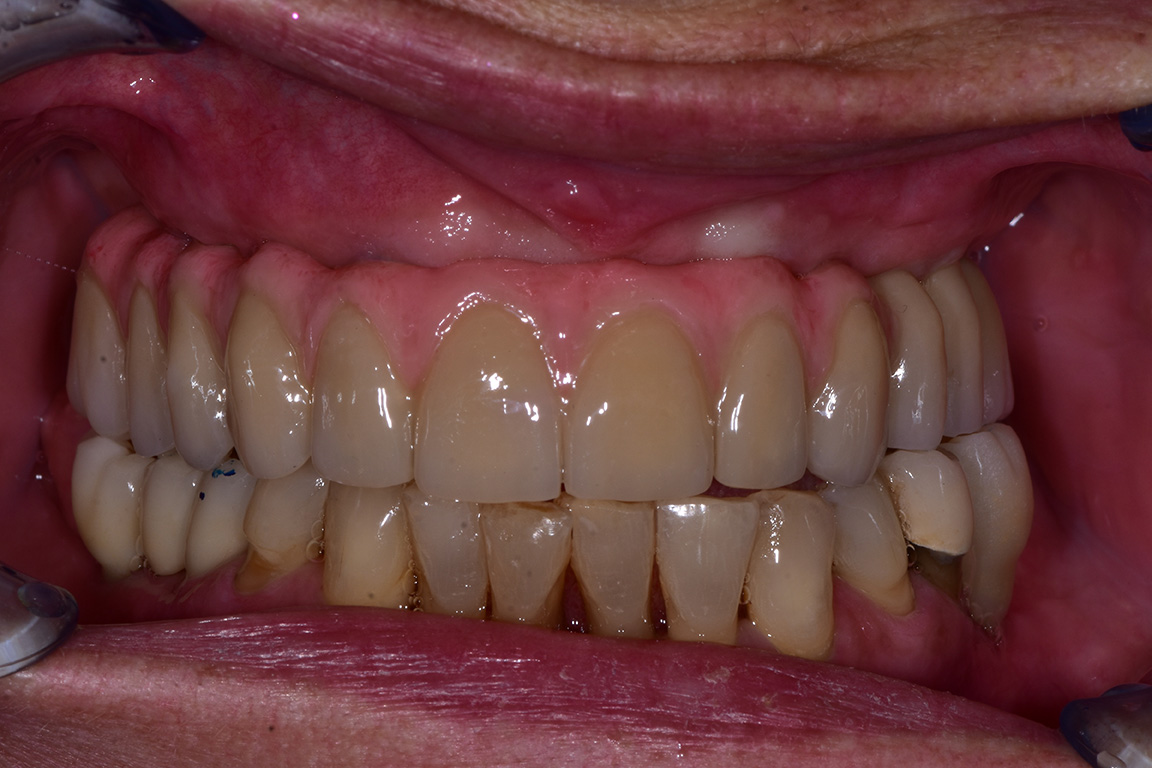 Riabilitazione implanto-protesica arcata superiore Riabilitazione implanto-protesica arcata superiore con tecnica All-On-Four, con protesi in composito su barra fresata in titanio. Photogallery: